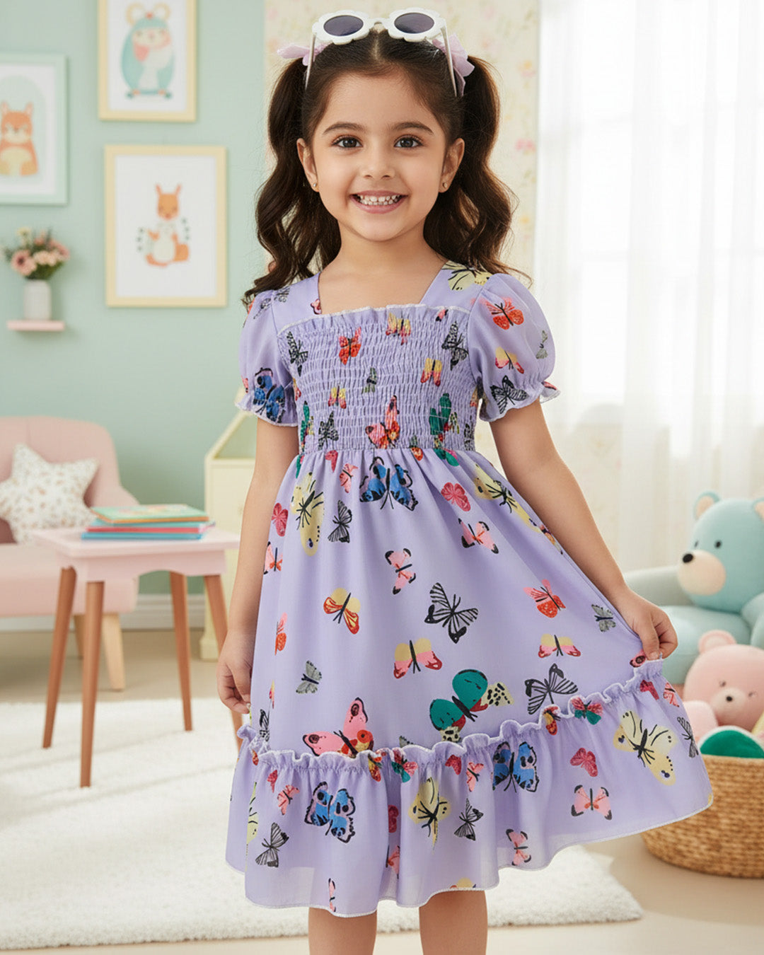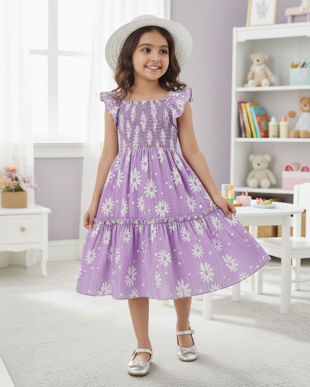 Girls Lavender Daisy Print Ruffle Sleeve Party Dress