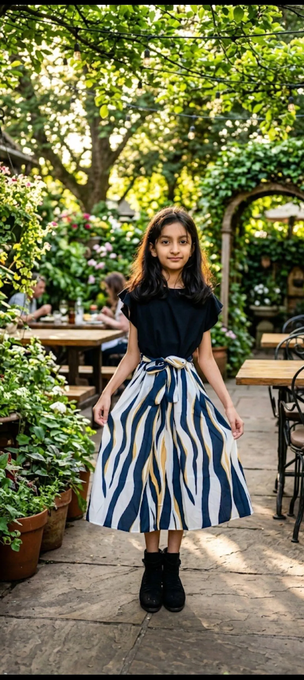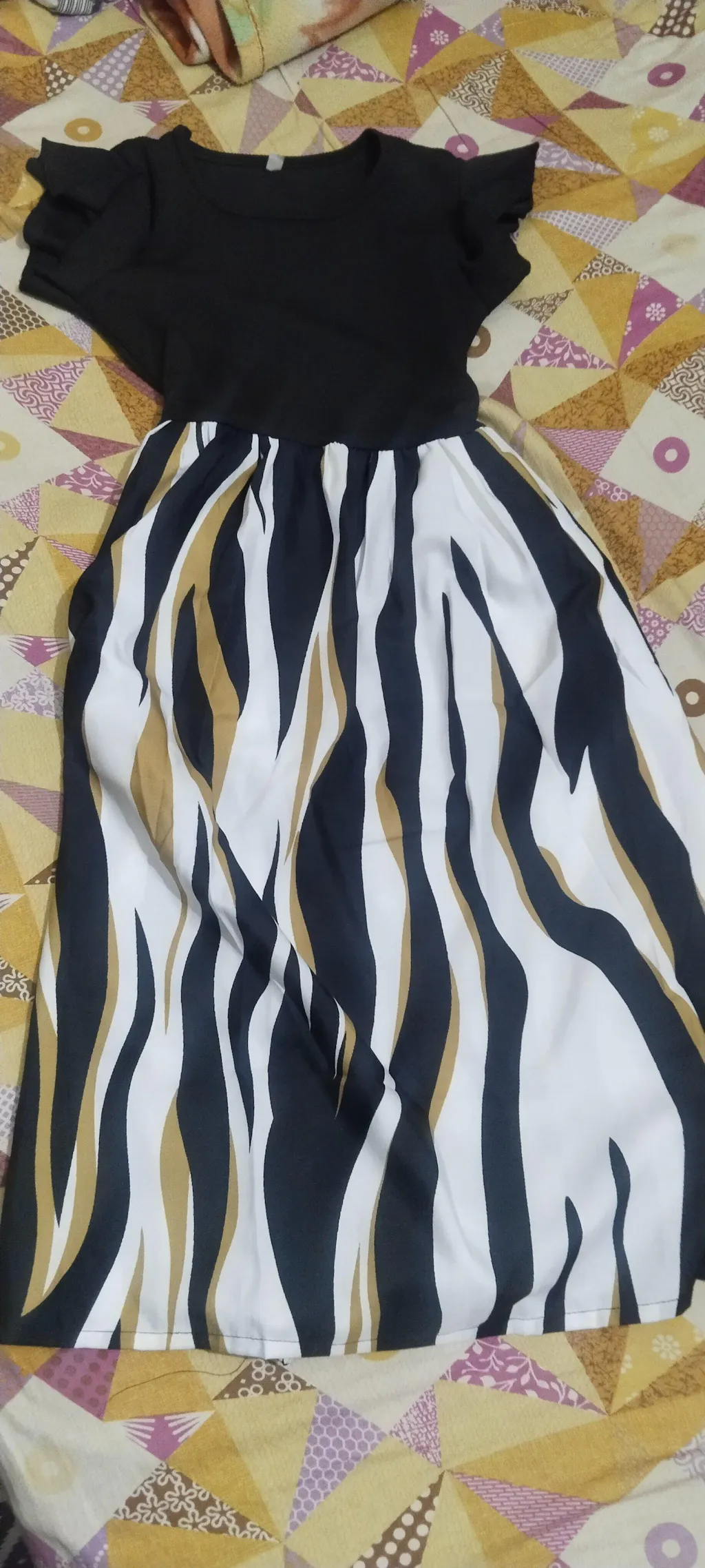 Make your little girl shine with this stylish black ruffle sleeve dress with striped skirt. The solid black ribbed top adds a touch of elegance, while the flowy A-line skirt with bold black, white, and gold stripes creates a modern, chic look. The waist tie-up bow enhances the fit and adds extra charm. Perfect for parties, birthdays, family gatherings, and casual outings, this dress combines comfort and fashion effortlessly.