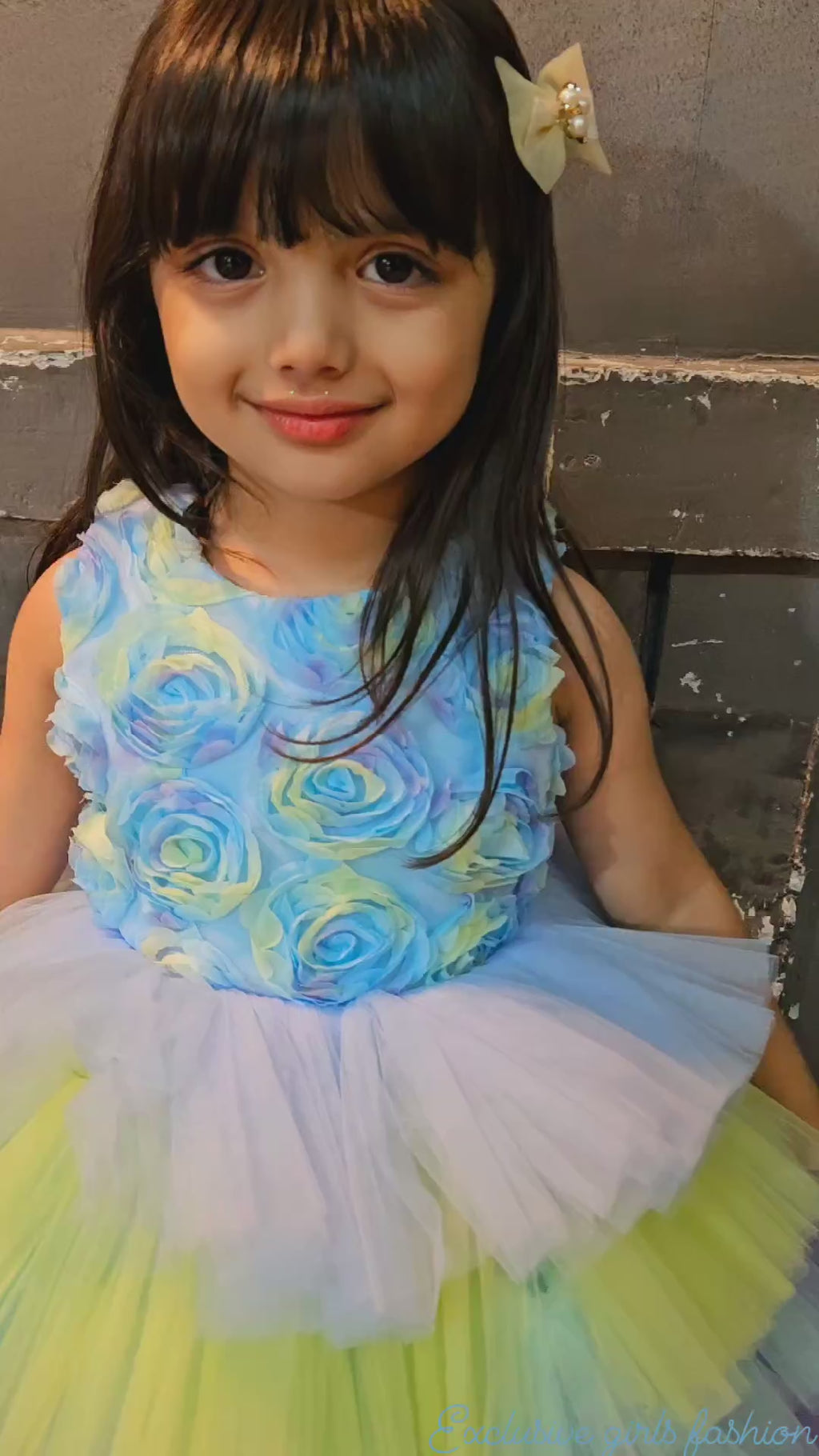 Brighten your little girl's special day with this stunning multicolor layered tulle party frock. The dress features a beautifully crafted 3D floral bodice in soothing pastel blue tones, paired with a vibrant rainbow-style layered skirt that adds volume, charm, and a magical twirl effect.